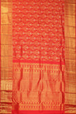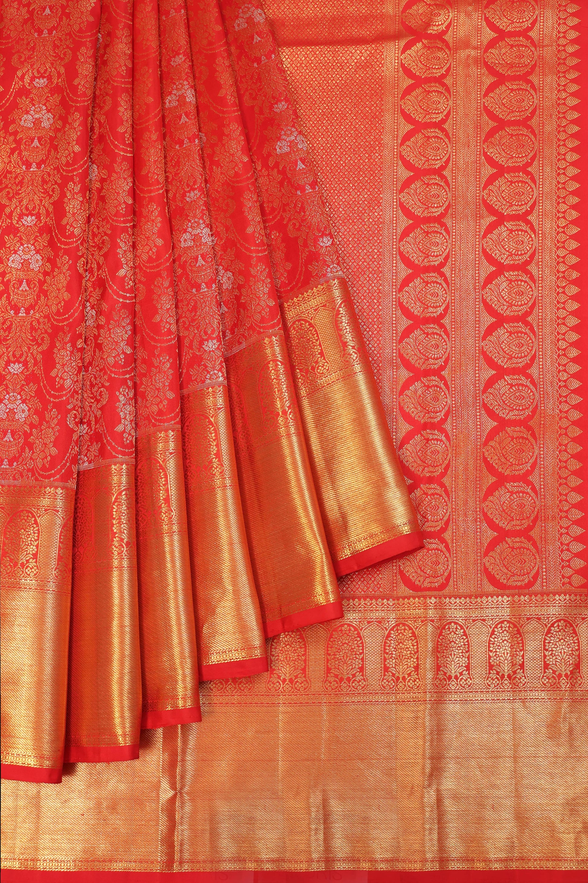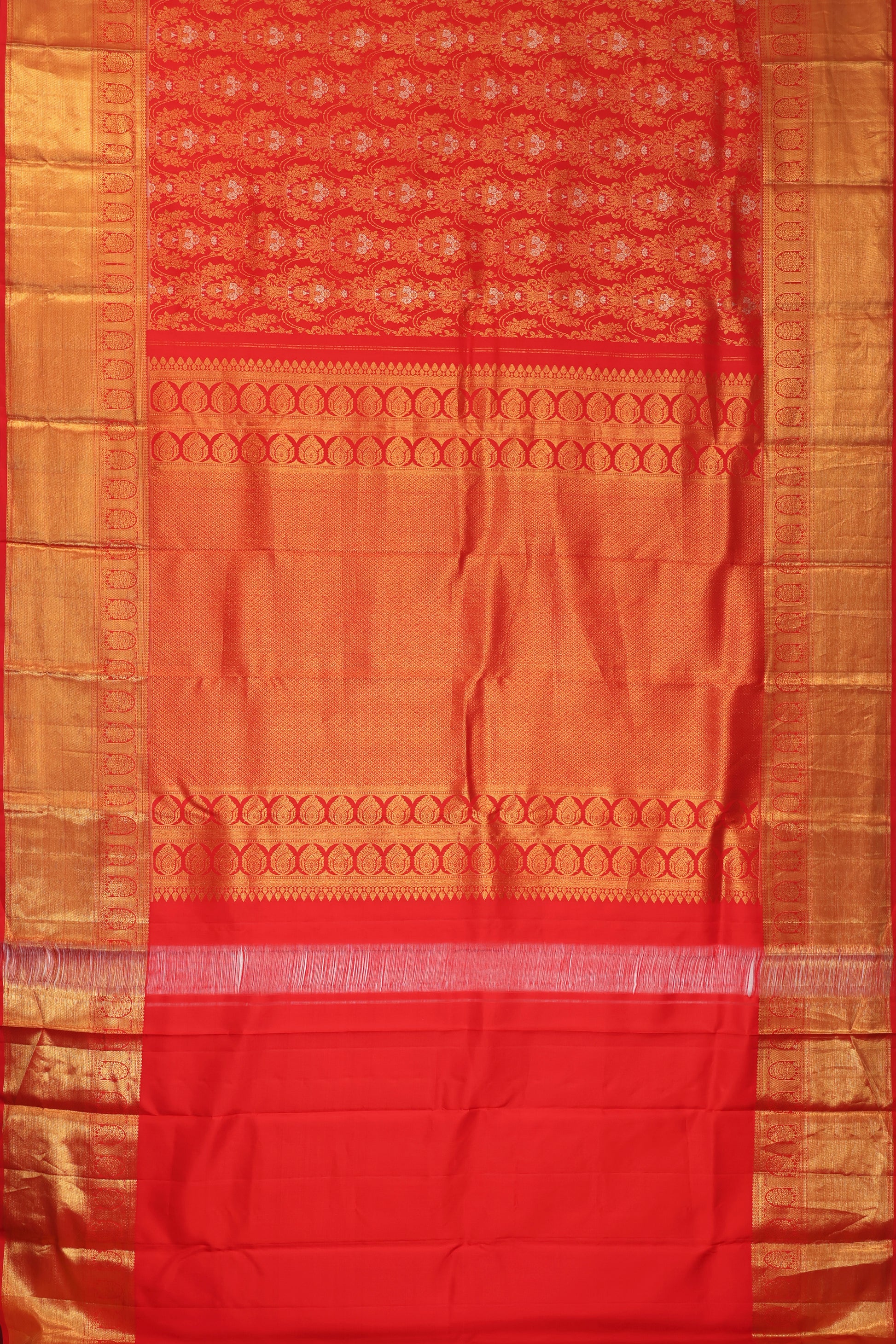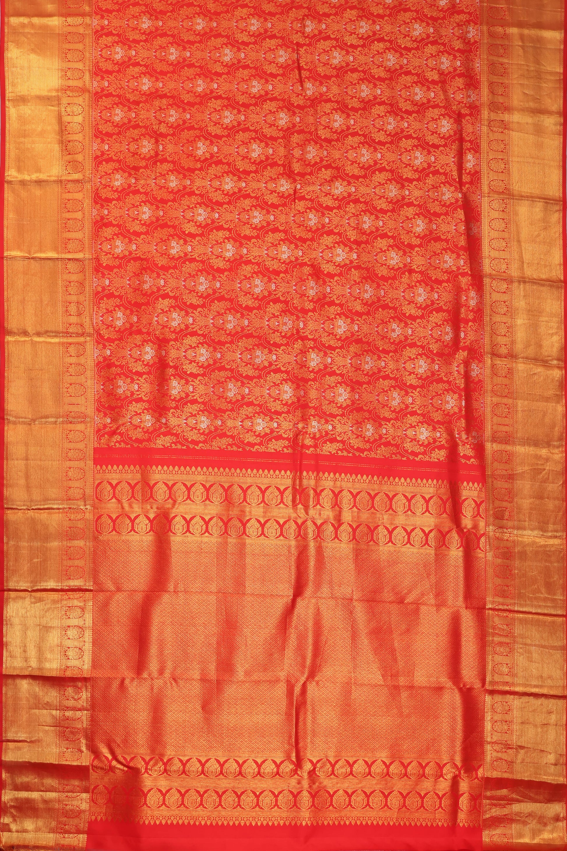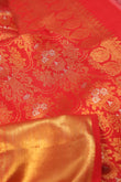 This radiant red Kanchipuram Silk Saree is a beautiful fusion of traditional artistry and luxurious design. The body is adorned with a delicate gold and silver zari floral jaal, creating a graceful and timeless appeal. The self-colored border features gold zari twill designs, flower motifs, and diamond buttas, adding a regal touch. The pallu, also in self-colored red, showcases flower and diamond buttas in gold zari. Paired with a plain red blouse with a matching border, this saree is perfect for weddings, festive occasions, and special celebrations.