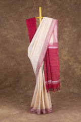 Classic elegance meets vibrant charm with this cream and red banana cotton saree. The rich maroon border and pallu perfectly complement the simplicity of the plain body design. Add a touch of sophistication to your wardrobe with this timeless piece.