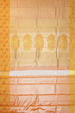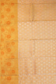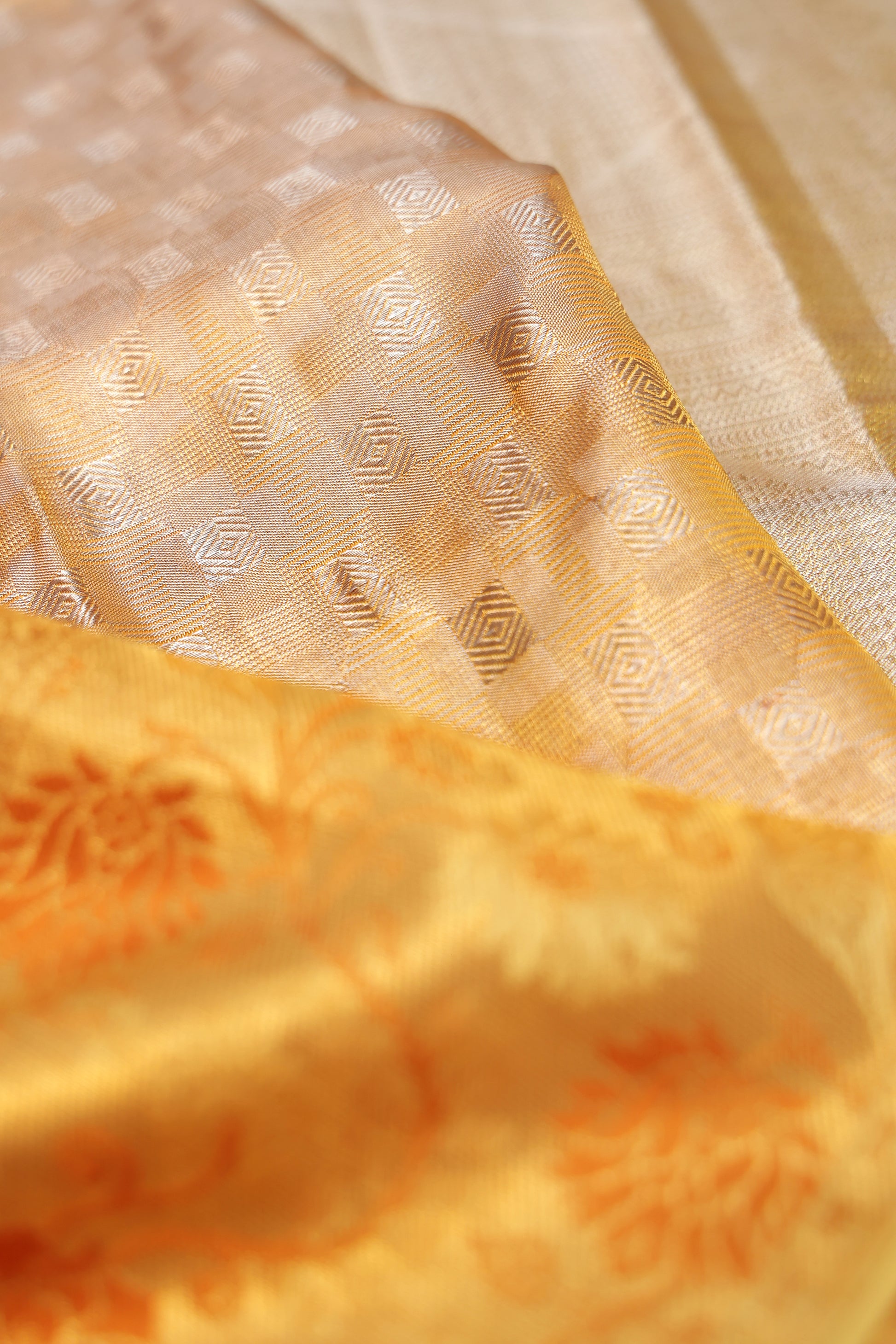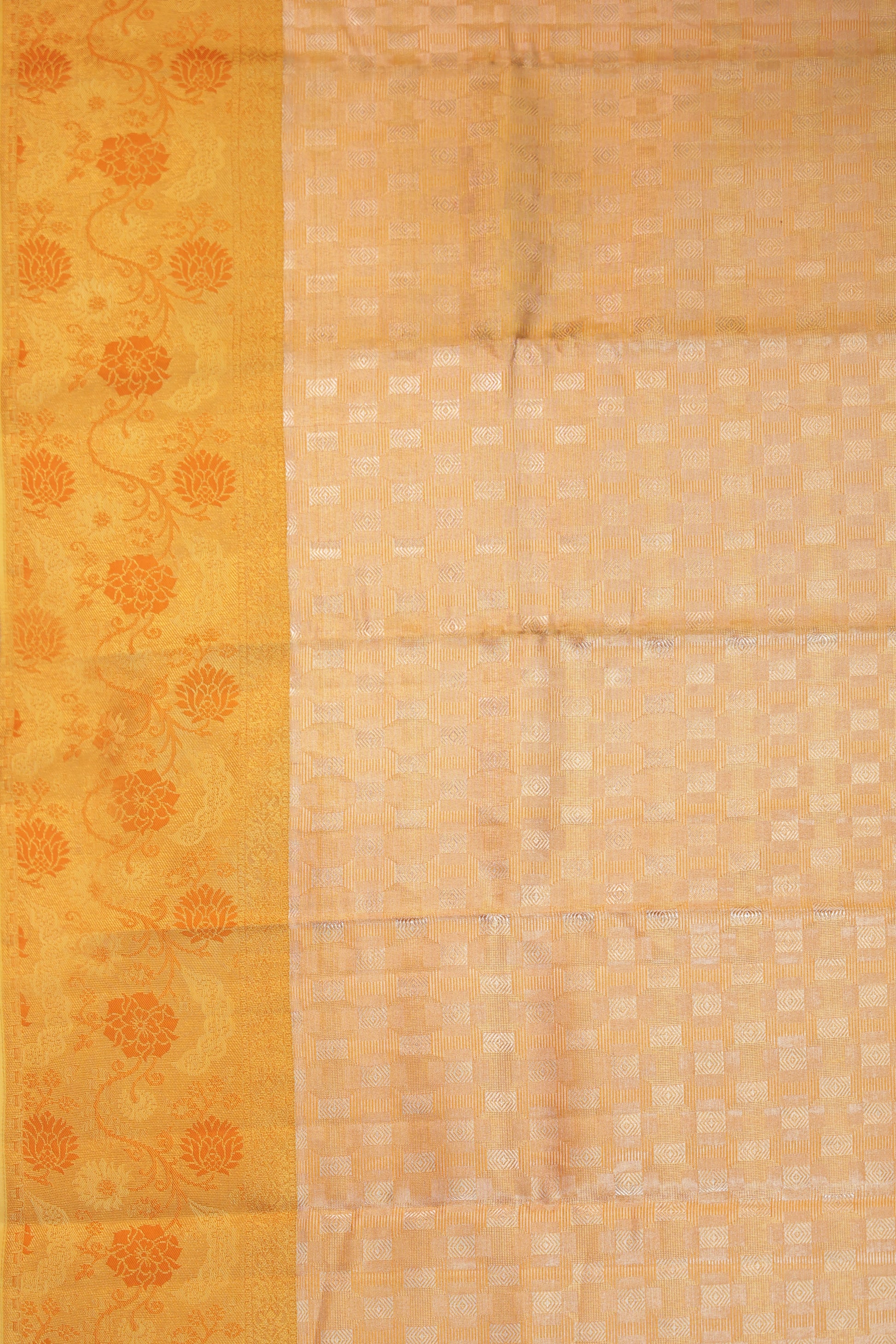Description - Grace meets grandeur in this Sandal Kanchipuram Silk Saree, adorned with a mustard gold zari border featuring floral creepers and leaf motifs. The body shimmers with intricate gold and silver geometrical patterns, complemented by a rich pallu woven with silver zari brocade buttas. A plain mustard blouse with border completes this timeless traditional ensemble.