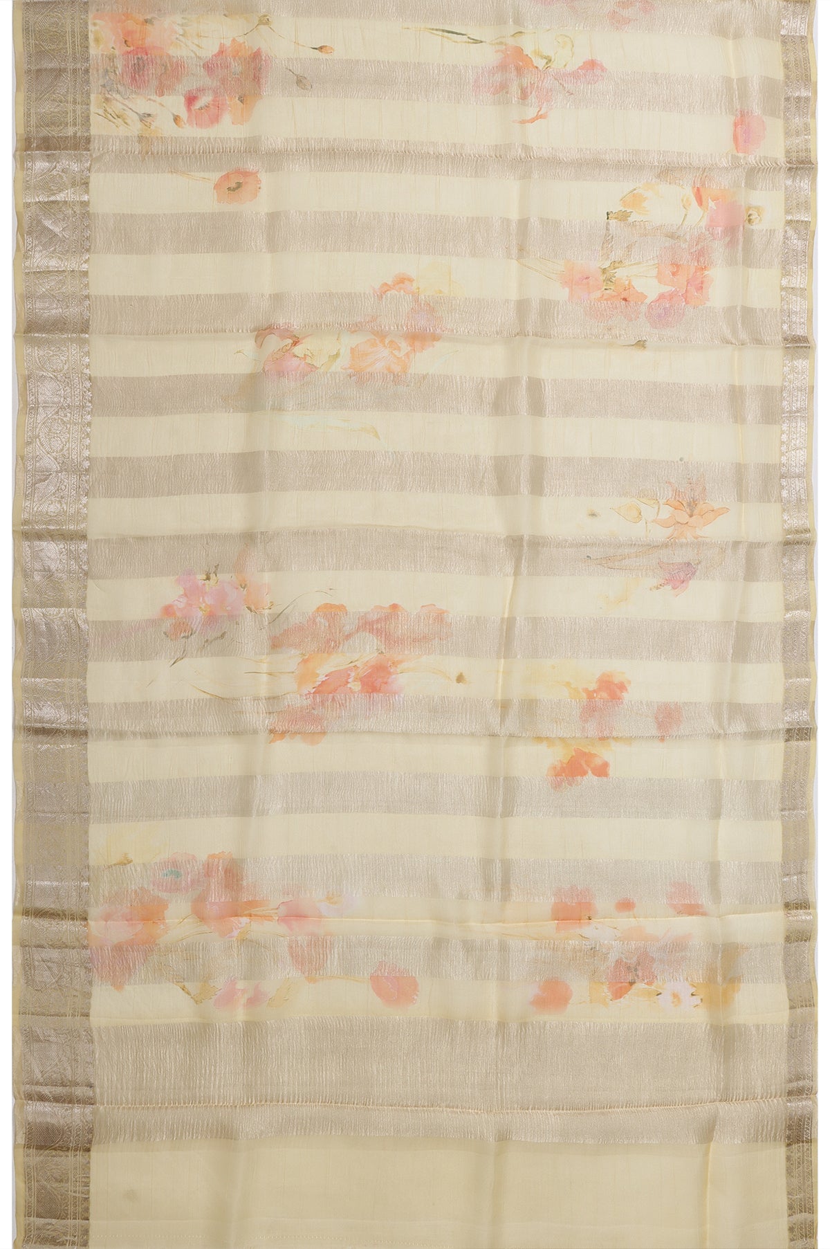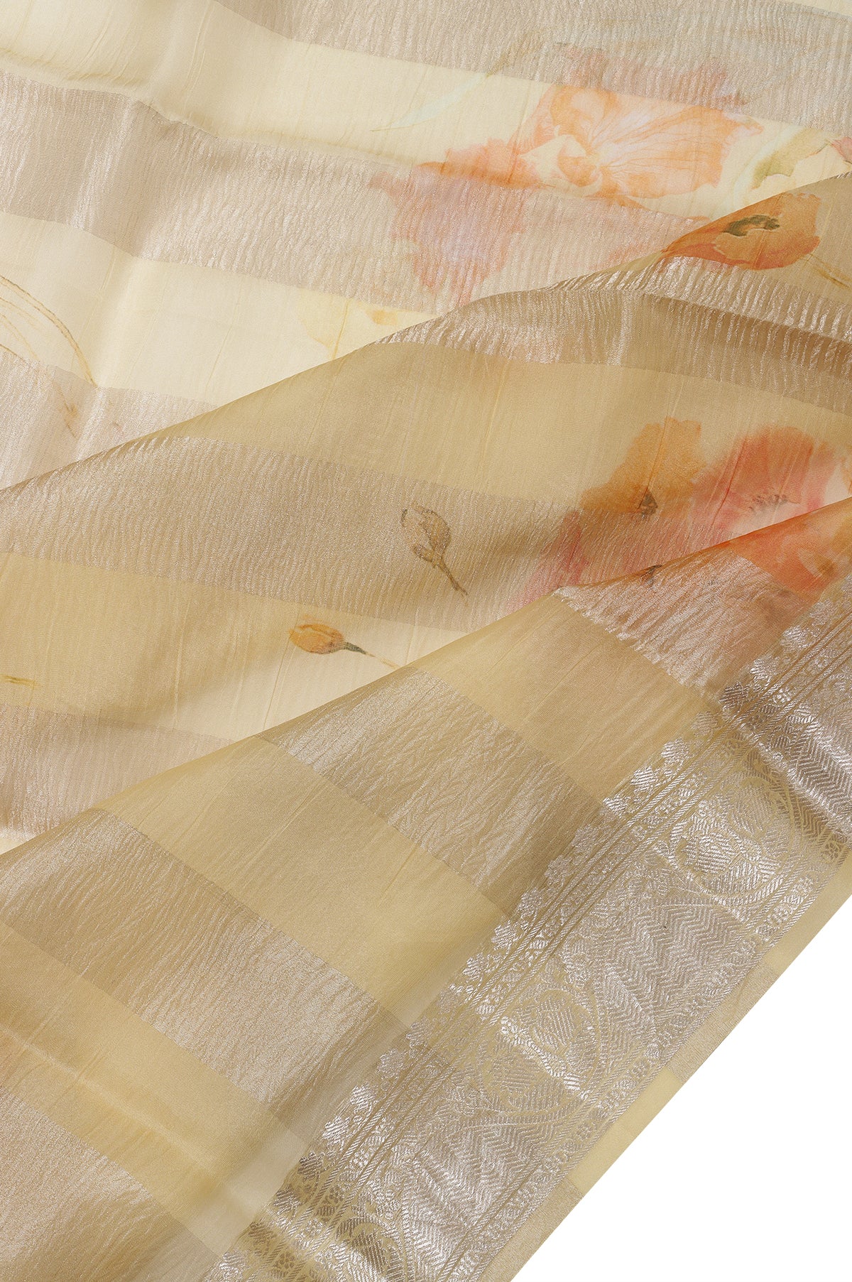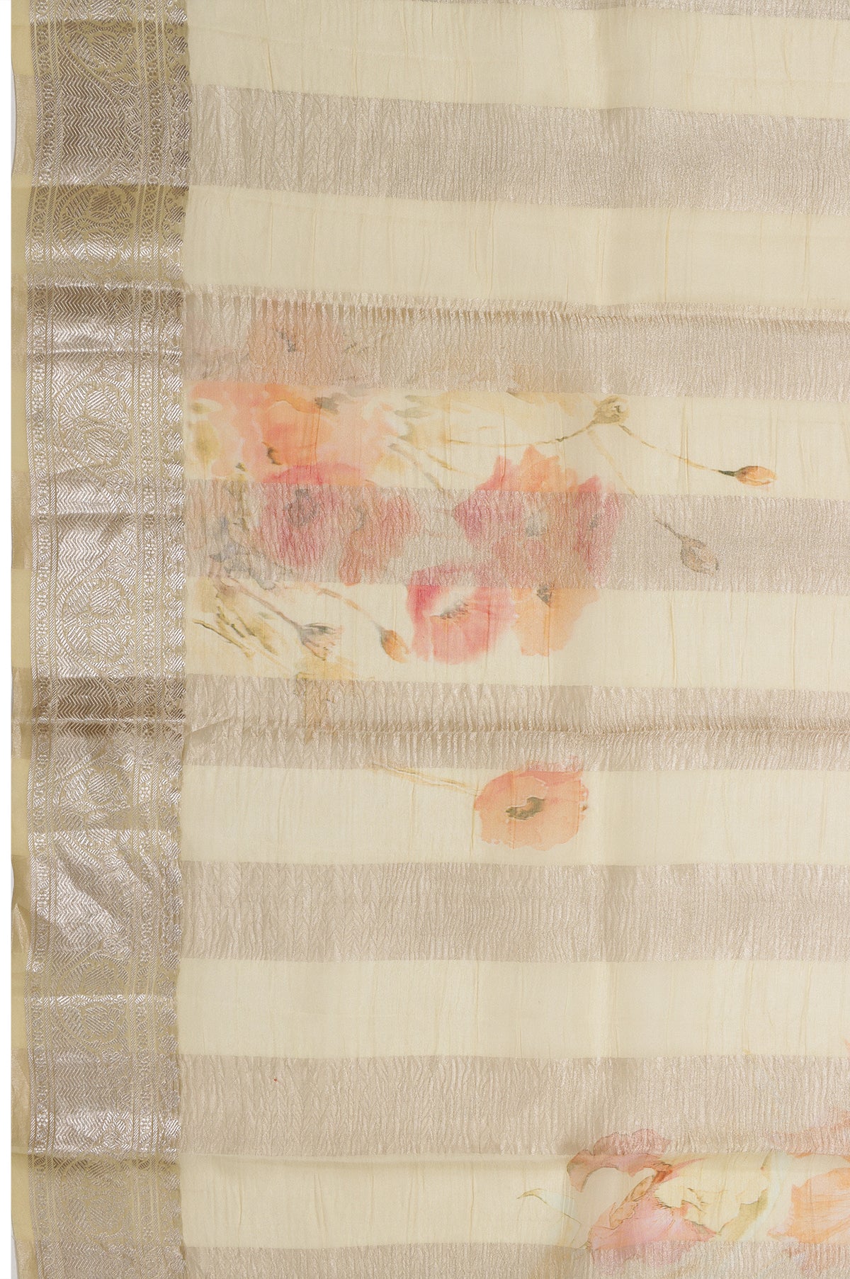Elegant and airy, this Sandal Organza Saree features delicate silver zari crush stripes beautifully paired with printed floral motifs across the body. The self silver zari border, adorned with floral creepers and flower buttas, lends a graceful shimmer. Its pallu showcases silver zari stripes and charming flower prints, finished with tassels. Paired with a chiniya self-printed blouse with border, perfect for graceful daytime celebrations.