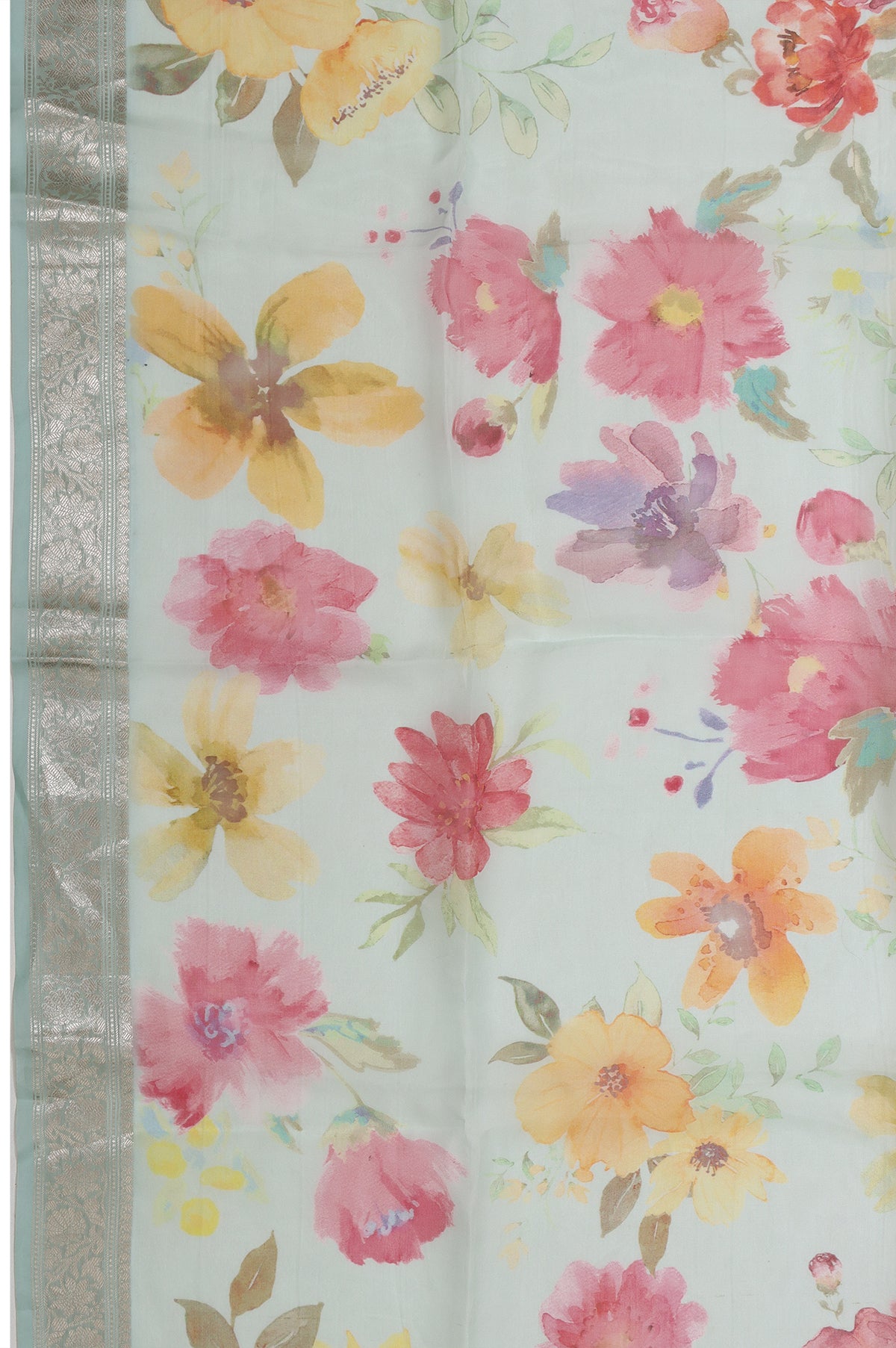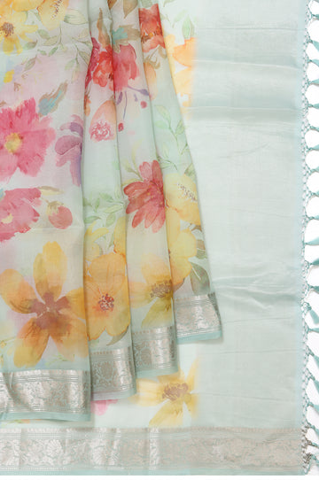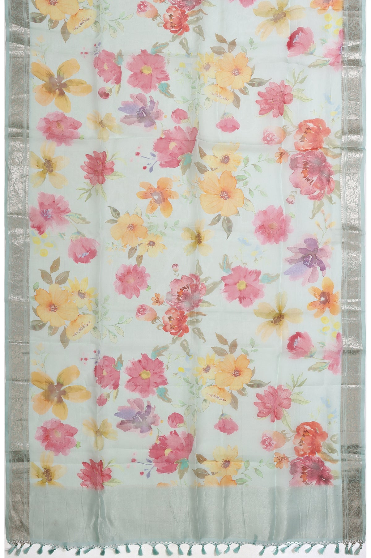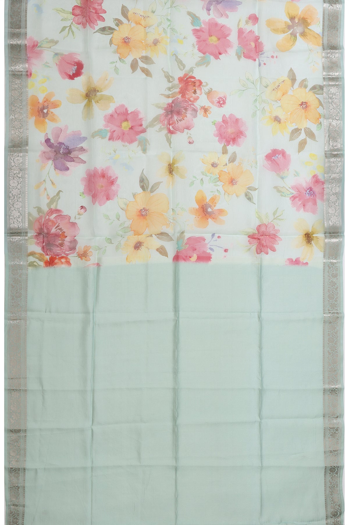 Sea Green Organza Saree with Silver Zari Border and Floral Design