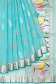 Elevate your style with this Sky Blue Kota Doria Silk Saree. It boasts a self-colored border with Silver Zari, Munia Butta. The Pallu is a work of art with self-color, Gold and Silver Zari, Flower Design with Meenakari work. The body design features captivating Gold and Silver Zari work with a delightful Leaf Design.