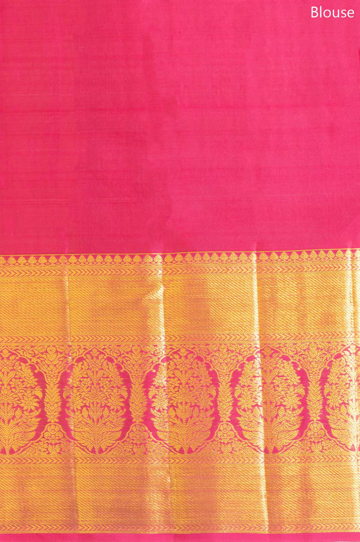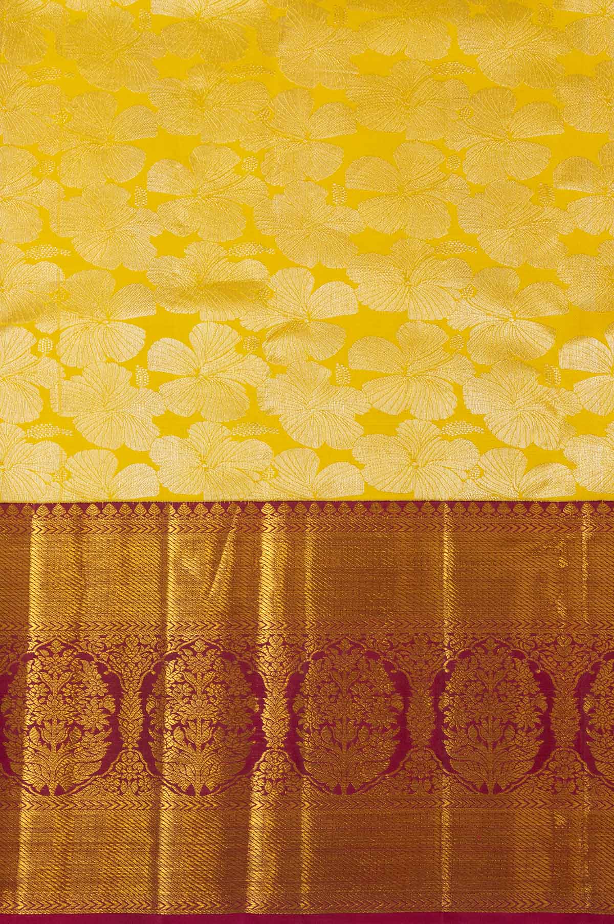Description: Ethnic and versatile yellow is anyone’s colour when it comes to dressing for opulent occasions. Let this gorgeous Kanchipuram Silk Saree speak for your love and respect for our culture. Team it with appropriate accessories and create a magic that casts a spell on onlookers. In this beautiful ensemble, yellow comes along with its age-old accompaniment maroon which rides the well-spread border. It is intricately decorated with gold zari, tree motifs, twill design and flower butta. The pallu has mayil motifs as special attraction. The saree is worth your devout attention.