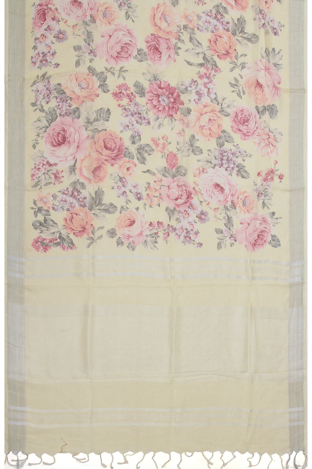 In a cheerful yellow, this Linen Cotton Saree features a silver zari kadi border and pallu with silver zari strips and tassels. The self blouse with a border complements the saree’s tree and flower motifs body design, creating a bright and elegant ensemble.