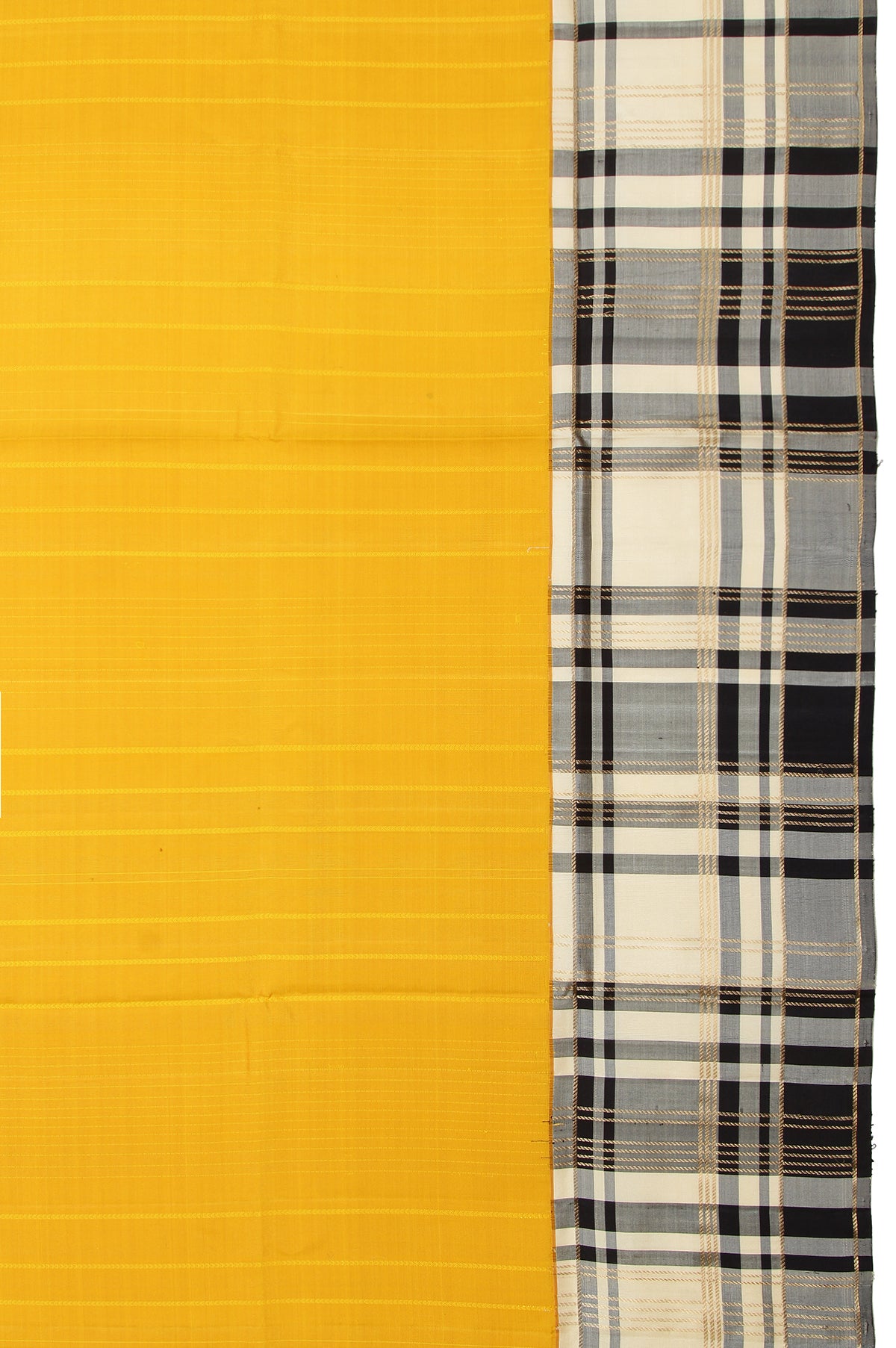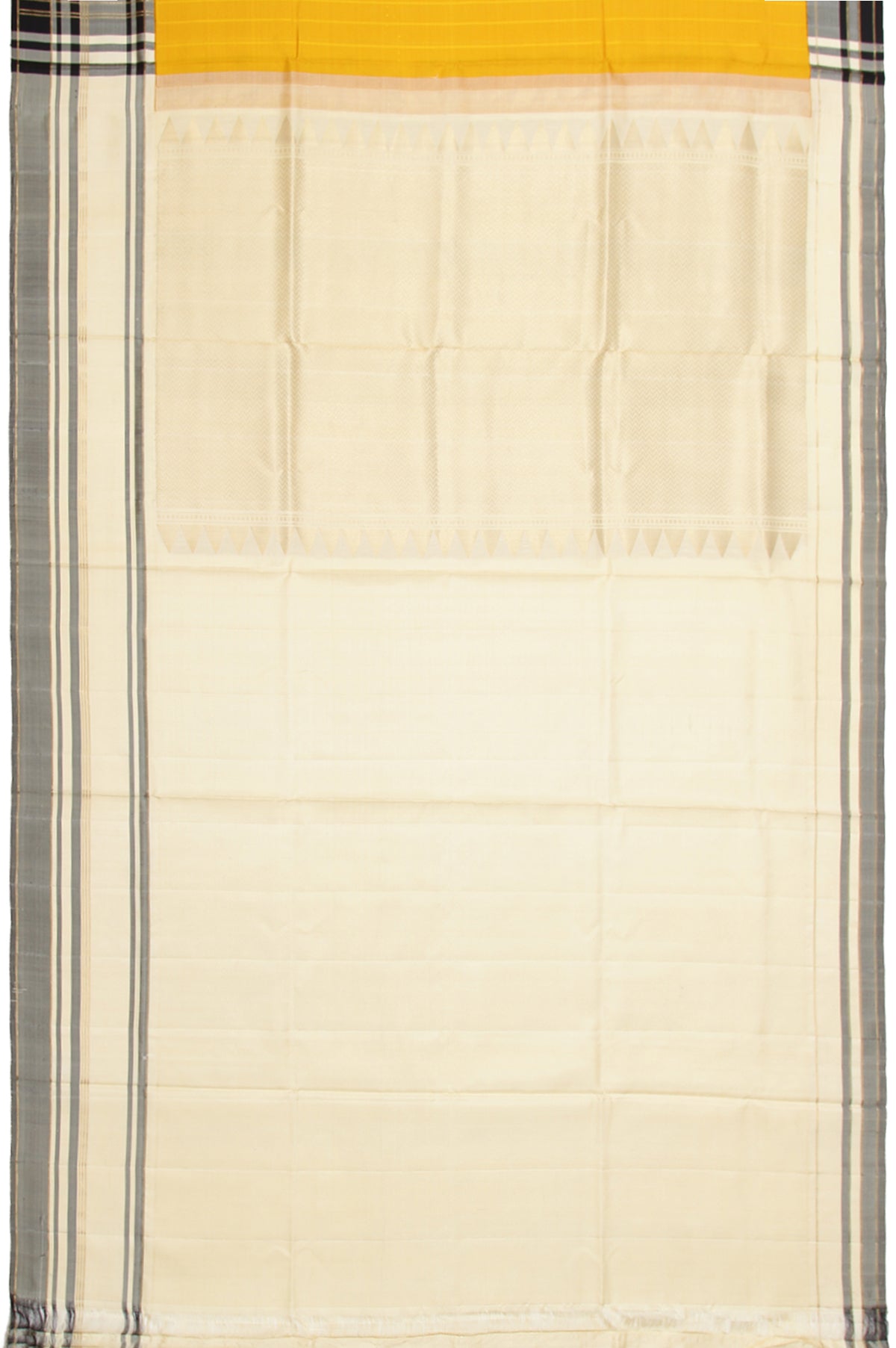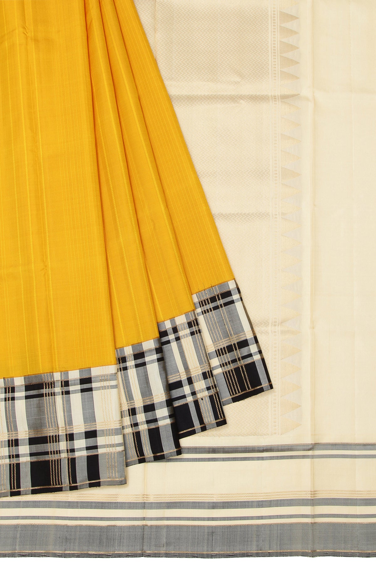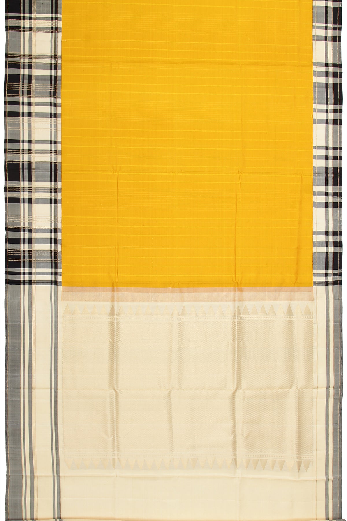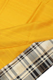 This Yellow soft silk saree features a unique cream and black checks border with gold zari, complemented by a cream pallu adorned with a chevron pattern, temple design, and square buttas. The plain cream blouse with a border completes the ensemble.